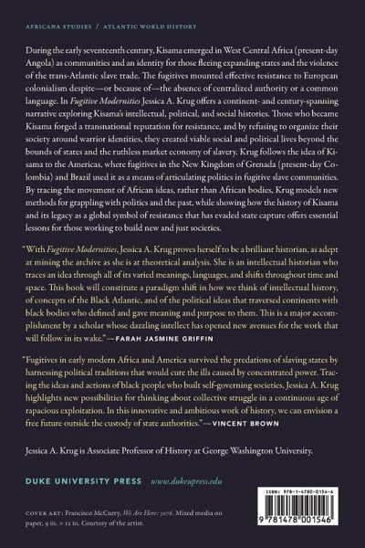 During the early seventeenth century, Kisama emerged in West Central Africa (present-day Angola) as communities and an identity for those fleeing expanding states and the violence of the trans-Atlantic slave trade. The fugitives mounted effective resistance to European colonialism despite-or because of-the absence of centralized authority or a common language. In Fugitive Modernities Jessica A. Krug offers a continent- and century-spanning narrative exploring Kisama's intellectual, political, and social histories. Those who became Kisama forged a transnational reputation for resistance, and by refusing to organize their society around warrior identities, they created viable social and political lives beyond the bounds of states and the ruthless market economy of slavery. Krug follows the idea of Kisama to the Americas, where fugitives in the New Kingdom of Grenada (present-day Colombia) and Brazil used it as a means of articulating politics in fugitive slave communities. By tracing the movement of African ideas, rather than African bodies, Krug models new methods for grappling with politics and the past, while showing how the history of Kisama and its legacy as a global symbol of resistance that has evaded state capture offers essential lessons for those working to build new and just societies.
