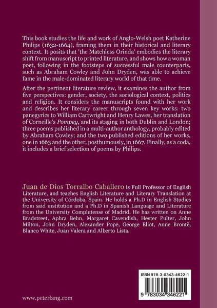 When the book titled Poems. By the Incomparable Mrs K.P. was published in 1664 Katherine Philips herself defined it as "those fugitive papers that have escap'd my hands", expressing her reluctance to publish them and her aversion to her works appearing in print. Despite her (apparent) modesty, Orinda and her work definitely occupied an important position in the literary field of that time. This book studies the life and work of Katherine Philips (1632-1664) from a historicist and socio-critical perspective. It posits that 'the Matchless Orinda' embodies the literary shift from manuscript to printed literature, and shows how a woman poet, following in the footsteps of successful male counterparts, such as Abraham Cowley and John Dryden, was able to achieve fame in the male-dominated literary world.