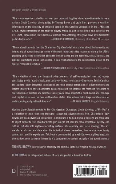 Fugitive Slave Advertisements in The City Gazette: Charleston, South Carolina, 1787-1797 is a collection of more than one thousand transcribed advertisements from Charleston’s daily newspaper. Each advertisement portrays, in miniature, a human drama of courage and resistance to unjust authority.