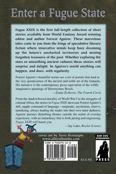 Fugue XXIX is the first full-length collection of short stories available from World Fantasy Award winning editor and author Forrest Aguirre. These marvelous tales come to you from the fringe of speculative literary fiction where innovative minds keep busy dreaming up the future's uncharted territories and mining forgotten treasures of the past. Whether exploring the stars or unearthing ancient cultures these stories will surprise and delight. In Aguirre's world anything can happen, and does, with regularity.