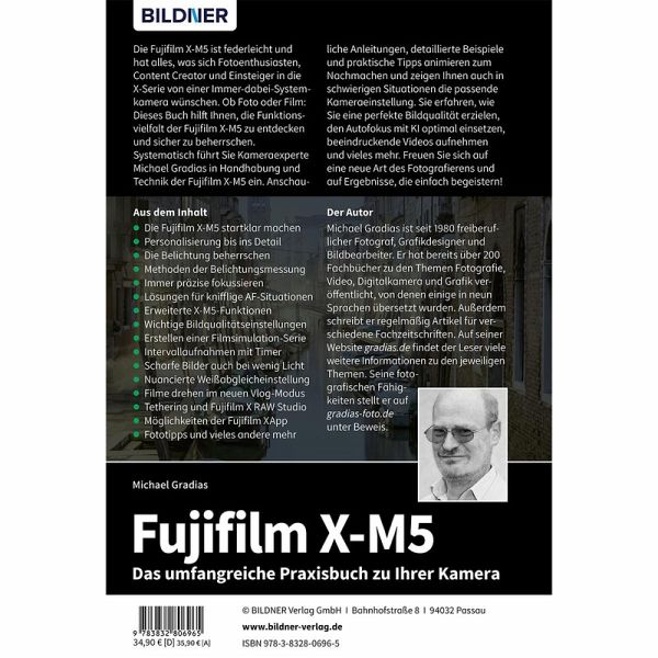 Die Fujifilm X-M5 ist federleicht und hat alles, was sich Fotoenthusiasten, Content Creator und Einsteiger in die X-Serie von einer Immer-dabei-Systemkamera wünschen. Ob Foto oder Film: Dieses Buch hilft Ihnen, die Funktionsvielfalt der Fujifilm X-M5 zu entdecken und sicher zu beherrschen. Systematisch führt Sie Kameraexperte Michael Gradias in Handhabung und Technik der Fujifilm X-M5 ein. Anschauliche Anleitungen, detaillierte Beispiele und praktische Tipps animieren zum Nachmachen und zeigen Ihnen auch in schwierigen Situationen die passende Kameraeinstellung. Sie erfahren, wie Sie eine perfekte Bildqualität erzielen, den Autofokus mit KI optimal einsetzen, beeindruckende Videos aufnehmen und vieles mehr. Freuen Sie sich auf eine neue Art des Fotografierens und auf Ergebnisse, die einfach begeistern!