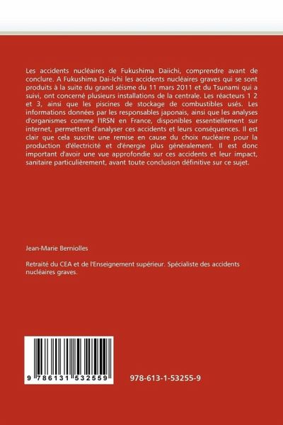 Les accidents nucléaires de Fukushima Daiichi, comprendre avant de conclure. A Fukushima Dai-Ichi les accidents nucléaires graves qui se sont produits à la suite du grand séisme du 11 mars 2011 et du Tsunami qui a suivi, ont concerné plusieurs installations de la centrale. Les réacteurs 1 2 et 3, ainsi que les piscines de stockage de combustibles usés. Les informations données par les responsables japonais, ainsi que les analyses d'organismes comme l'IRSN en France, disponibles essentiellement sur internet, permettent d'analyser ces accidents et leurs conséquences. Il est clair que cela suscite une remise en cause du choix nucléaire pour la production d'électricité et d'énergie plus généralement. Il est donc important d'avoir une vue approfondie sur ces accidents et leur impact, sanitaire particulièrement, avant toute conclusion définitive sur ce sujet.