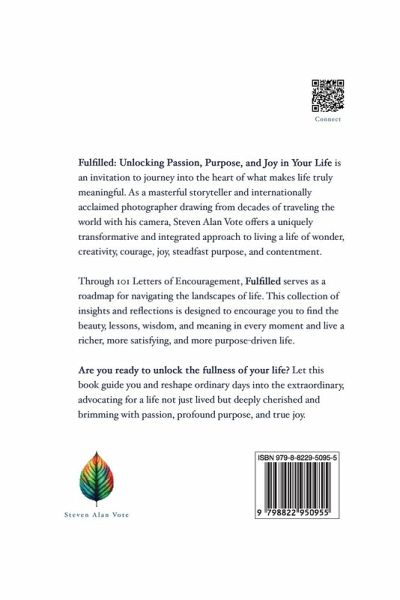 Unlock Your Life's Full Potential: A Guide to Embrace Wonder, Creativity, Courage, and Joy; Transform Ordinary Days into Extraordinary; Cherish Life with Passion and Purpose. Explore the core of life's true essence with Fulfilled: Unlocking Passion, Purpose, and Joy in Your Life. This book invites you to discover what makes life truly meaningful. As a masterful storyteller and internationally acclaimed photographer, Steven Alan Vote draws from decades of traveling the world with his camera, offering a uniquely transformative approach to living a life full of wonder, creativity, courage, joy, steadfast purpose, and contentment. Through 101 Letters of Encouragement, Fulfilled is as a roadmap for navigating life's landscapes. This collection of insights and reflections encourages you to find beauty, lessons, wisdom, and meaning in every moment and live a richer, more satisfying, and purpose-driven life. Are you ready to unlock the fullness of your life? Let this book guide you and reshape ordinary days into the extraordinary, advocating for a life not just lived, but deeply cherished and brimming with passion, profound purpose, and true joy.