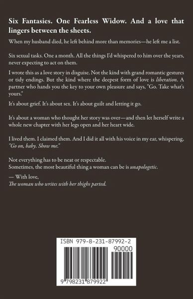 Six fantasies. One fearless widow. And a love that lingers between the sheets. When my husband died, he left behind more than memories-he left me a list. Six sexual tasks. One a month. All the things I'd whispered to him over the years, never expecting to act on them. From seducing strangers to surrendering control... From lapdances to threesomes, one unforgettable couple, and the night of a lifetime... I lived them. I claimed them. And I did it all with his voice in my ear, whispering, "Go on, baby. Show me." This is not just a story of sex. It's a story of rebirth. Of a woman taking her pleasure back-one fantasy at a time. Sometimes, the most beautiful thing a woman can be is unapologetic.