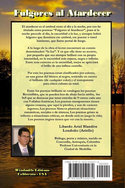 El atardecer es el umbral entre el día y la noche, por eso he titulado estos poemas "Fulgores al Atardecer", pues si la noche precede al día, la oscuridad a la luz, y siempre habrá fulgores que iluminen ese umbral, ese puente o túnel luminoso, que llamo portal de fuego. A lo largo de la obra el lector encontrará un común denominador: "la luz". Y es que ella tiene su secreto, por pequeña que sea siempre brillará con su propia intensidad, en la oscuridad más espesa, negra e infinita. Entre los poemas brillante se catalogan los poemas Reversibles, que se pueden leer de abajo hacia arriba, los 9x9 que se destacan por tener estrofas de 9 versos cada uno con 9 sílabas fonéticas; Los poemas transparentes tienen alguna censura, que aquí la pierden, y son de carácter ingenuo; Los poemas blancos plantean situaciones románticas, sociales o de tristeza; Los poemas grises se refieren a situaciones críticas, en donde está en juego la vida; Los poemas negros tienen que ver con la muerte.