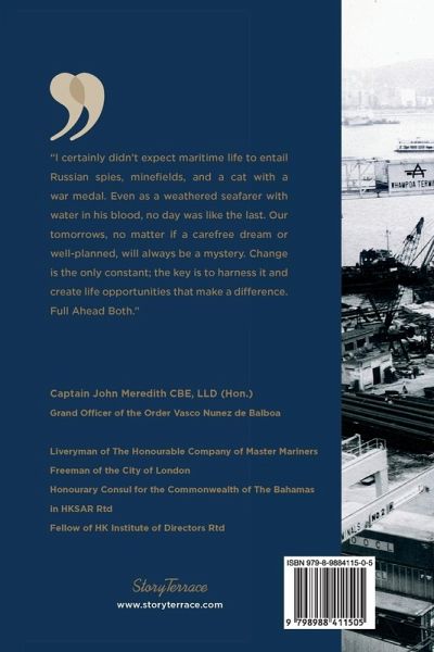 "I certainly didn't expect maritime life to entail spies, minefields, and a cat with a war medal. Even as a weathered seafarer with water in his blood, no day was like the last. Our tomorrows, no matter if a carefree dream or well-planned, will always be a mystery. Change is the only constant; the key is to harness it and create life opportunities that make a difference." Full Ahead Both: A Life of Ships, Spies, and Seaports is the epic true story of one man's life on and around the sea. Captain John E. Meredith CBE had a brilliant maritime career before becoming "the father of global ports development", having founded a company that transformed the ports industry and built the world's largest container port. His is a story that spans the globe: meeting kings and queens - including Queen Elizabeth II - and tribal leaders; drinking vodka with Russian spies; dancing on cruise liners; getting left behind on a life raft; and all the while being blessed with a wonderful and supportive family. From his first taste of the salty sea air as a child fleeing a war-torn country to a vibrant and adventurous seafaring career that led to his becoming a pioneer of the modern shipping industry, Captain John E Meredith's life is a swashbuckling adventure that inspires and excites - a life filled with seemingly insurmountable challenges, myriad roadblocks, confusing intersections, exhilarating victories, and a rich tapestry of unforgettable people and experiences: from greenhorn cruise ship cadet to the last living Master & Commander. Full ahead both. About the Author Born in the United Kingdom, Captain John E. Meredith began his ship and shore career with a 10-year course of education and practical training, spent towards obtaining his qualifications as a Master Mariner. His sea-going career, spanning a total of 18 years, included regular calls to Hong Kong , during which time he developed a deep and abiding interest in Asia. He served on every class of vessel from general cargo to modern cruise liners, oil tankers and troopships . Dr. Meredith was until recently Deputy Chairman of Hutchison Port Holdings Limited (HPH), the world's largest port holding company with 56 ports in 27 countries, which he founded in Hong Kong in 1972. He has received numerous awards for his services to the international maritime industry as a pioneer in containerisation. In 2011, he was made Commander of the Order of the British Empire (CBE) by Queen Elizabeth II. In January 2014, he relocated residence to the Republic of Panama and is currently the chairman of a private family company JEM Capital Group Inc. He is married to Mrs. Liliana Meredith and the family have had a home in Casco Antiguo, Panama for 15 years.