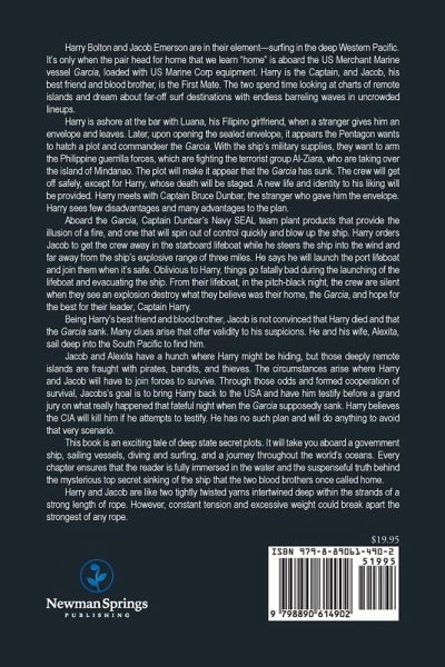 Harry Bolton and Jacob Emerson are in their element--surfing in the deep Western Pacific. It's only when the pair head for home that we learn "home" is aboard the US Merchant Marine vessel Garcia, loaded with US Marine Corp equipment. Harry is the Captain, and Jacob, his best friend and blood brother, is the First Mate. The two spend time looking at charts of remote islands and dream about far-off surf destinations with endless barreling waves in uncrowded lineups. Harry is ashore at the bar with Luana, his Filipino girlfriend, when a stranger gives him an envelope and leaves. Later, upon opening the sealed envelope, it appears the Pentagon wants to hatch a plot and commandeer the Garcia. With the ship's military supplies, they want to arm the Philippine guerrilla forces, which are fighting the terrorist group Al-Ziara, who are taking over the island of Mindanao. The plot will make it appear that the Garcia has sunk. The crew will get off safely, except for Harry, whose death will be staged. A new life and identity to his liking will be provided. Harry meets with Captain Bruce Dunbar, the stranger who gave him the envelope. Harry sees few disadvantages and many advantages to the plan. Aboard the Garcia, Captain Dunbar's Navy SEAL team plant products that provide the illusion of a fire, and one that will spin out of control quickly and blow up the ship. Harry orders Jacob to get the crew away in the starboard lifeboat while he steers the ship into the wind and far away from the ship's explosive range of three miles. He says he will launch the port lifeboat and join them when it's safe. Oblivious to Harry, things go fatally bad during the launching of the lifeboat and evacuating the ship. From their lifeboat, in the pitch-black night, the crew are silent when they see an explosion destroy what they believe was their home, the Garcia, and hope for the best for their leader, Captain Harry. Being Harry's best friend and blood brother, Jacob is not convinced that Harry died and that the Garcia sank. Many clues arise that offer validity to his suspicions. He and his wife, Alexita, sail deep into the South Pacific to find him. Jacob and Alexita have a hunch where Harry might be hiding, but those deeply remote islands are fraught with pirates, bandits, and thieves. The circumstances arise where Harry and Jacob will have to join forces to survive. Through those odds and formed cooperation of survival, Jacobs's goal is to bring Harry back to the USA and have him testify before a grand jury on what really happened that fateful night when the Garcia supposedly sank. Harry believes the CIA will kill him if he attempts to testify. He has no such plan and will do anything to avoid that very scenario. This book is an exciting tale of deep state secret plots. It will take you aboard a government ship, sailing vessels, diving and surfing, and a journey throughout the world's oceans. Every chapter ensures that the reader is fully immersed in the water and the suspenseful truth behind the mysterious top secret sinking of the ship that the two blood brothers once called home. Harry and Jacob are like two tightly twisted yarns intertwined deep within the strands of a strong length of rope. However, constant tension and excessive weight could break apart the strongest of any rope.