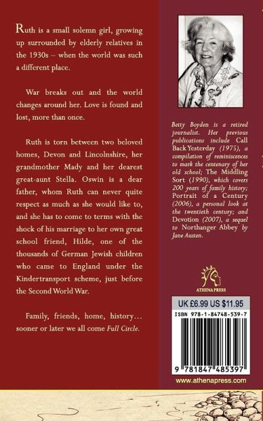 Ruth is a small solemn girl, growing up surrounded by elderly relatives in the 1930s - when the world was such a different place. War breaks out and the world changes around her. Love is found and lost, more than once. Ruth is torn between two beloved homes, Devon and Lincolnshire, her grandmother Mady and her dearest great-aunt Stella. Oswin is a dear father whom Ruth can never quite respect as much as she would like to. Hilde is a friend at school who becomes part of Ruth's life so unexpectedly. And then there is Bill... Family, friends, home, history... sooner or later we all come Full Circle. Betty Boyden is a retired journalist. Her previous publications include Call Back Yesterday (1975), a compilation of reminiscences to mark the centenary of her old school; The Middling Sort (1990), which covers 200 years of family history; Portrait of a Century (2006), a personal look at the twentieth century; and Devotion (2007), a sequel to Northanger Abbey by Jane Austen.