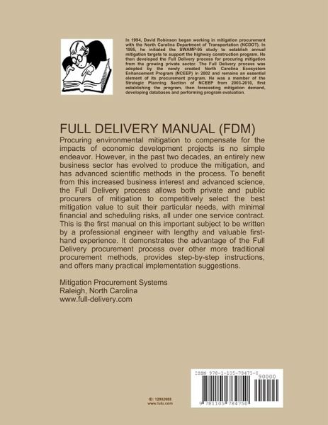 The Full Delivery Manual is an essential document for private companies and public agencies wishing to procure compensatory mitigation or habitat restoration in the most effective manner possible. The Full Delivery process is explained in detail, including the planning required in advance, the request for proposals, organizational requirements, the review of technical proposals, the calculation of unit cost for each type of mitigation, the opening of sealed cost proposals, the selection of bidders offering the best value product, and the award and management of service contracts. The process can be applied to projects in all parts of the United States and other nations.