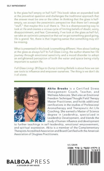 Is the glass half-empty or half-full? This book takes an expanded look at the proverbial question and challenges the traditional approach that the answer must be one or the other. In thinking that the glass is half-empty, we accept the pessimistic perspective that there isn't enough "stuff," that maybe this is all there is. This is a disempowering way to look at life and creates a vicious cycle of limiting beliefs of doubt, worry, disappointment, and fear. Conversely, if we look at the glass as half-full, we take an optimistic perspective that we've got something good going, life is grand. Yet, there is that lingering sense that something may still be missing. What is presented in this book is something different. How about looking at the glass as always full? In Full Glass Living, the author shares her life journey through emotional sensitivity and a mood disorder to adopt an enlightened perception of both the water and space being vitally important to sustain life. Full Glass Living: 28 Days to Dump Limiting Beliefs is about how we can use tools to influence and empower ourselves. The thing is we don't do it all alone.