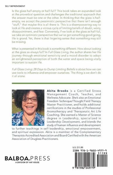 Is the glass half-empty or half-full? This book takes an expanded look at the proverbial question and challenges the traditional approach that the answer must be one or the other. In thinking that the glass is half-empty, we accept the pessimistic perspective that there isn't enough "stuff," that maybe this is all there is. This is a disempowering way to look at life and creates a vicious cycle of limiting beliefs of doubt, worry, disappointment, and fear. Conversely, if we look at the glass as half-full, we take an optimistic perspective that we've got something good going, life is grand. Yet, there is that lingering sense that something may still be missing. What is presented in this book is something different. How about looking at the glass as always full? In Full Glass Living, the author shares her life journey through emotional sensitivity and a mood disorder to adopt an enlightened perception of both the water and space being vitally important to sustain life. Full Glass Living: 28 Days to Dump Limiting Beliefs is about how we can use tools to influence and empower ourselves. The thing is we don't do it all alone.