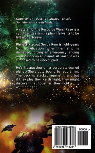 Opportunity doesn't always knock. Sometimes, it crash lands. A veteran of the Resource Wars, Raze is a cyborg with a simple plan. He wants to be left alone, forever. Planetary scout Sevda Rem is light-years from civilization when her ship is damaged, forcing an emergency landing on an unoccupied planet. At least, it was supposed to be unoccupied... He's trespassing on a corporate-owned planet. She's duty bound to report him. The deck is stacked against them, but if they play their cards right, they might discover that together, they hold a winning hand.