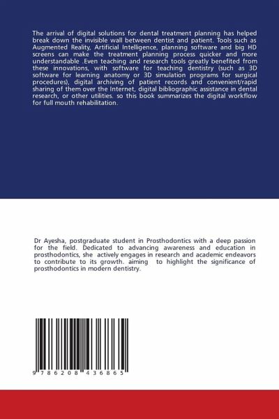 The arrival of digital solutions for dental treatment planning has helped break down the invisible wall between dentist and patient. Tools such as Augmented Reality, Artificial Intelligence, planning software and big HD screens can make the treatment planning process quicker and more understandable .Even teaching and research tools greatly benefited from these innovations, with software for teaching dentistry (such as 3D software for learning anatomy or 3D simulation programs for surgical procedures), digital archiving of patient records and convenient/rapid sharing of them over the Internet, digital bibliographic assistance in dental research, or other utilities. so this book summarizes the digital workflow for full mouth rehabilitation.