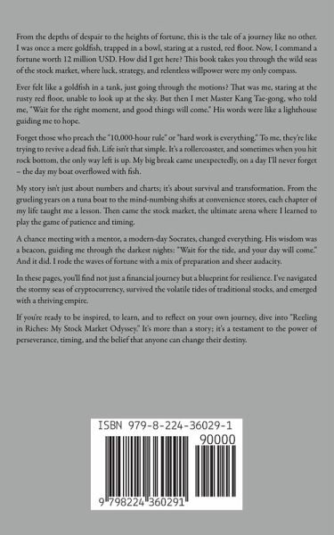 From the depths of despair to the heights of fortune, this is the tale of a journey like no other. I was once a mere goldfish, trapped in a bowl, staring at a rusted, red floor. Now, I command a fortune worth 12 million USD. How did I get here? This book takes you through the wild seas of the stock market, where luck, strategy, and relentless willpower were my only compass. Ever felt like a goldfish in a tank, just going through the motions? That was me, staring at the rusty red floor, unable to look up at the sky. But then I met Master Kang Tae-gong, who told me, "Wait for the right moment, and good things will come." His words were like a lighthouse guiding me to hope. Forget those who preach the "10,000-hour rule" or "hard work is everything." To me, they're like trying to revive a dead fish. Life isn't that simple. It's a rollercoaster, and sometimes when you hit rock bottom, the only way left is up. My big break came unexpectedly, on a day I'll never forget - the day my boat overflowed with fish. My story isn't just about numbers and charts; it's about survival and transformation. From the grueling years on a tuna boat to the mind-numbing shifts at convenience stores, each chapter of my life taught me a lesson. Then came the stock market, the ultimate arena where I learned to play the game of patience and timing. A chance meeting with a mentor, a modern-day Socrates, changed everything. His wisdom was a beacon, guiding me through the darkest nights: "Wait for the tide, and your day will come." And it did. I rode the waves of fortune with a mix of preparation and sheer audacity. In these pages, you'll find not just a financial journey but a blueprint for resilience. I've navigated the stormy seas of cryptocurrency, survived the volatile tides of traditional stocks, and emerged with a thriving empire. If you're ready to be inspired, to learn, and to reflect on your own journey, dive into "Reeling in Riches: My Stock Market Odyssey." It's more than a story; it's a testament to the power of perseverance, timing, and the belief that anyone can change their destiny.