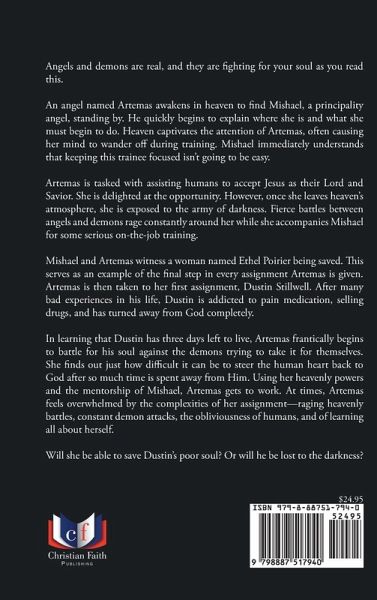 Ethereal and immortal forces of good and evil battle fiercely in a chess game for humanity's fate. A guardian angel, Artemas, wakes up in heaven to find Mishael, a principality and her mentor, standing by. He quickly briefs and equips her to do her job: guide humans to accept Jesus Christ as their lord and savior. Her first assignment is Dustin Stillwell, an addict of pain medication and local drug dealer. He's turned completely away from God after a devastating car wreck, leaving him with permanent deformities. Artemas is delighted at the opportunity, but upon leaving the safety of heaven, she is exposed to the army of darkness. Artemas immediately becomes overwhelmed by the complexities of her assignment: raging spiritual battles, constant demon attacks, the obliviousness of humans, and learning all about herself, simultaneously. Her human, Dustin, has three days to turn his life around. Can Artemas save his poor soul?