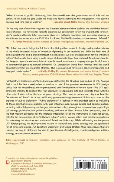 Full Spectrum Diplomacy and Grand Strategy: Reforming the Structure and Culture of U.S. Foreign Policy, by John Lenczowski offers a solution to one of the greatest weaknesses in U.S. foreign policy that has exacerbated the unprecedented anti-Americanism of recent years-the U.S. Government's inability to conduct the "full spectrum" of diplomatic arts and to integrate them with the other arts of statecraft at the level of grand strategy.