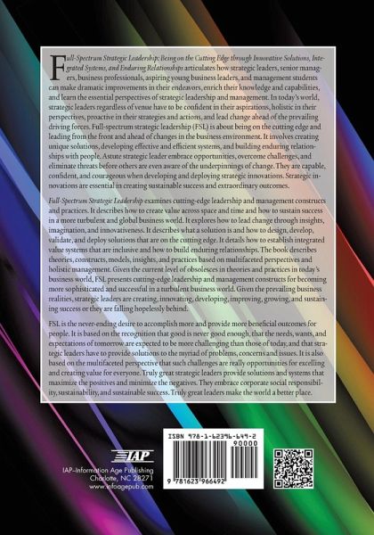 Full-Spectrum Strategic Leadership: Being on the Cutting Edge through Innovative Solutions, Integrated Systems, and Enduring Relationships articulates how strategic leaders, senior managers, business professionals, aspiring young business leaders, and management students can make dramatic improvements in their endeavors, enrich their knowledge and capabilities, and learn the essential perspectives of strategic leadership and management. In today's world, strategic leaders regardless of venue have to be confident in their aspirations, holistic in their perspectives, proactive in their strategies and actions, and lead change ahead of the prevailing driving forces. Full-spectrum strategic leadership (FSL) is about being on the cutting edge and leading from the front and ahead of changes in the business environment. It involves creating unique solutions, developing effective and efficient systems, and building enduring relationships with people. Astute strategic leader embrace opportunities, overcome challenges, and eliminate threats before others are even aware of the underpinnings of change. They are capable, confident, and courageous when developing and deploying strategic innovations. Strategic innovations are essential in creating sustainable success and extraordinary outcomes. The book examines cutting-edge leadership and management constructs and practices. It describes how to create value across space and time and how to sustain success in a more turbulent and global business world. It explores how to lead change through insights, imagination, and innovativeness. It describes what a solution is and how to design, develop, validate, and deploy solutions that are on the cutting edge. It details how to establish integrated value systems that are inclusive and how to build enduring relationships. The book describes theories, constructs, models, insights, and practices based on multifaceted perspectives and holistic management. Given the current level of obsolesces in theories and practices in today's business world, FSL presents cutting-edge leadership and management constructs for becoming more sophisticated and successful in a turbulent business world. Given the prevailing business realities, strategic leaders are creating, innovating, developing, improving, growing, and sustaining success or they are falling hopelessly behind. FSL is the never-ending desire to accomplish more and provide more beneficial outcomes for people. It is based on the recognition that good is never good enough, that the needs, wants, and expectations of tomorrow are expected to be more challenging than those of today, and that strategic leaders have to provide solutions to the myriad of problems, concerns and issues. It is also based on the multifaceted perspective that such challenges are really opportunities for excelling and creating value for everyone. Truly great strategic leaders provide solutions and systems that maximize the positives and minimize the negatives. They embrace corporate social responsibility, sustainability, and sustainable success. Truly great leaders make the world a better place.
