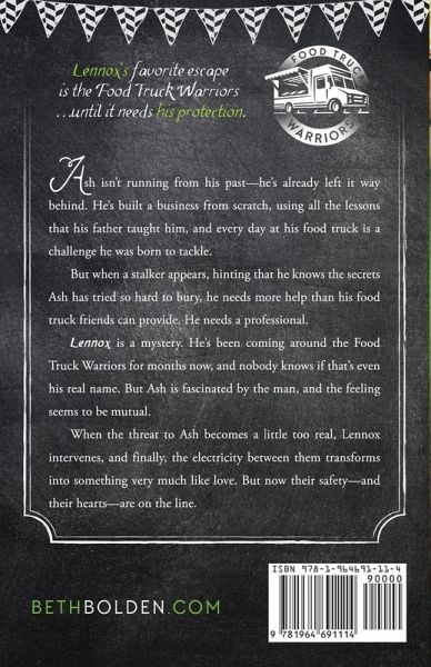 Lennox's favorite escape is the Food Truck Warriors . . .until it needs his protection. Ash isn't running from his past-he's already left it way behind. He's built a business from scratch, using all the lessons that his father taught him, and every day at his food truck is a challenge he was born to tackle. But when a stalker appears, hinting that he knows the secrets Ash has tried so hard to bury, he needs more help than his food truck friends can provide. He needs a professional. Lennox is a mystery. He's been coming around the Food Truck Warriors for months now, and nobody knows if that's even his real name. But Ash is fascinated by the man, and the feeling seems to be mutual. When the threat to Ash becomes a little too real, Lennox intervenes, and finally, the electricity between them transforms into something very much like love. But now their safety-and their hearts-are on the line.