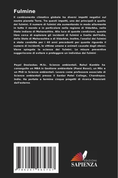 Il cambiamento climatico globale ha diversi impatti negativi sul nostro pianeta Terra. Tra questi impatti, uno dei principali è quello dei fulmini. Il numero di fulmini sta aumentando in modo allarmante in tutto il mondo e in particolare nella regione di Vidarbha, nello Stato indiano di Maharashtra. Alla luce di queste condizioni, questo libro cerca di esplorare gli incidenti di fulmini a livello dell'India, dello Stato di Maharashtra e di Vidarbha. Inoltre, l'analisi dei fulmini è stata condotta per i 40 anni precedenti per quanto riguarda il numero di incidenti, le vittime umane e animali causate dagli stessi. Viene spiegata la scienza dei fulmini. Le misure preventive suggeriscono di evitare e proteggere un individuo dai fulmini .