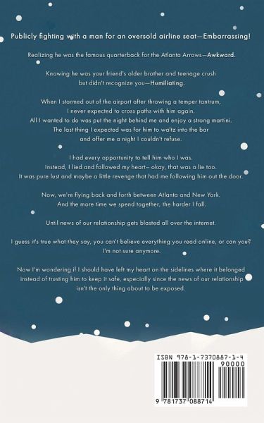 Publicly fighting with a man for an oversold airline seat-Embarrassing! Realizing he was the famous Quarterback for the Atlanta Arrows-Awkward Knowing he was your friend's older brother and teenage crush but didn't recognize you-Humiliating. When I stormed out of the airport after throwing a temper tantrum, I never expected to cross paths with him again. All I wanted to do was put the night behind me and enjoy a strong martini. The last thing I expected was for him to waltz into the bar and offer me a night I couldn't refuse. I had every opportunity to tell him who I was. Instead, I lied and followed my heart- okay, that was a lie too. It was pure lust and maybe a little revenge that had me following him out the door. Now, we're flying back and forth between Atlanta and New York. And the more time we spend together, the harder I fall. Until news of our relationship gets blasted all over the internet. I guess it's true what they say, you can't believe everything you read online, or can you? I'm not sure anymore. Now I'm wondering if I should have left my heart on the sidelines where it belonged instead of trusting him to keep it safe, especially since the news of our relationship isn't the only thing about to be exposed.
