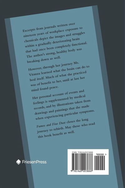 In a sense this book wrote itself. Excerpts from journals written over nineteen years of workplace exposure to chemicals depict the images and struggles within a gradually deteriorating brain that had once been completely functional. The author's strong, healthy body was breaking down as well. However, through her journey Ms. Vitanza learned what the brain can do to heal itself. Much of what she practiced was of benefit to her, until at last her mind found piece. Her personal account of events and feelings is supplemented by medical records, and by illustrations taken from drawings and paintings that she made when experiencing particular symptoms. Fumes and Fine Dust closes the long journey to rebirth. May those who read this book benefit as well.