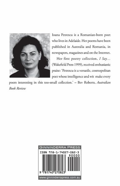 Ioana Petrescu is a Romanian-born poet who lives in Adelaide. Her poems have been published in Australia and Romania, in newspapers, magazines and on the Internet. Her first poetry collection, I Say… (Wakefield Press 1999), received enthusiastic praise: 'Petrescu is a versatile, cosmopolitan poet whose intelligence and wit make every poem interesting in this too-small collection.' - Bev Roberts, Australian Book Review
