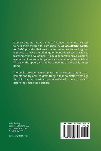 Most parents are always trying to find new and innovative toys to help their children to learn more. "Fun Educational Games for Kids" provides that solution and more. As technology has improved so have the offerings on educational toys geared to fostering child development. It could be something as simple as a set of blocks or something as advanced as a computer or tablet. Whatever the option, it has to be something that the child enjoys using. The books provides actual options in the various chapters that parents can try and the great thing is that no matter what age the child may be, there is an option available for them to research before they make the purchase.