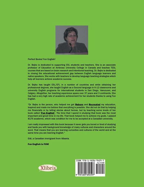 Perfect Books! Fun English! Dr. Bejko is dedicated to supporting ESL students and teachers. She is an associate professor of Education at Ambrose University College in Canada and teaches TESL courses that are based on brain research and intentional teaching. Dr. Bejko is dedicated to closing the educational achievement gap between English language learners and native speakers. She works with teachers to develop language teaching strategies which help all learners achieve academic success. Dr. Bejko has taught ESL/EFL in a number of countries and while obtaining her professional degrees, she taught English as a Second language in K-12 classrooms and university English programs for international students in San Diego, Vancouver, and Calgary. Altogether, her teaching experience spans over 37 years and 3 continents. She has had a very high rate of academic achievement for her students thanks to using Fun English. "Dr. Bejko is the person, who helped me get Reborn and Recreated my education, Inspired and made me believe that everything is possible. She did not do that by helping me fi nancially or by telling stories about heroes, but by teaching some levels of her book called "Fun English". The time that I spend in studying that book was the most important and great time in my life. That book helped me to achieve my goals. I passed IELTS academic, which was condition for me to be accepted at a Canadian university. I am really impressed with this book because it never gets you bored or tired of studying and feeds you with background knowledge of many cultures and characters around the word. That means that you are learning curiosities and cultures of the world and at the same time you are learning English. " Eldi, a Canadian immigrant from Albania.