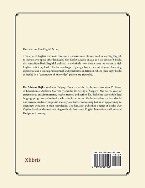 Dear users of Fun English Series, This series of English textbooks comes as a response to an obvious need in teaching English to learners who speak other languages. Fun English Series is unique as it is a series of 8 books that starts from Basic English Level and, in a relatively short time it takes the learner to high English proficiency level. This does not happen by magic but it is a result of years of teaching experience and a sound philosophical and practical foundation in which these eight books compiled in a "continuum of knowledge" pattern are grounded.