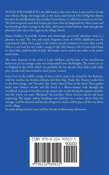 FUN IN THE HARBOUR is the fifth book in the series where Laura and her friends meet Mystic Marge, the barge lady, at the local canal festival. One of Big Sue's llamas becomes ill, and Blackjack, the travellers' horse doctor, is called into action to save him. The bad-tempered canal lock keeper gets more than he bargained for when Laura and her friends get their revenge in the dark, cold waters of the harbour. And what ghostly phantom lurks above the organ in the village church. Simon Dudley's beautifully written and charmingly portrayed, adventure series is a pleasure to read. The lost and nearly forgotten years of 1950's childhood can be experienced within these pages as the author cleverly immerses you into their world. This is a real treat for any reader, young or old, who fancies a bit of time-travel back to when kids could literally be kids. The books can be read in any order as the stories stand alone. The main character in the series is Laura McBean, and because of her mischievous behaviour, in her younger years, was nicknamed Laura McNaughty. The stories are set in England in the 1950s which was probably the last decade where kids could safely play outside and roam around to their hearts' content. Laura lives in the middle cottage of three, which used to be owned by the Railways, with her mother, her brother, Johnny, and their dog, Trudy. Her Nanny Conks lives in the first cottage, and "Neverin" (her Aunty Nancy) lives in the third. Their garden backs onto Stokey's woods, and the beach is a fifteen-minute walk through the woodland. A group of travellers set up camp in the woods during the summer months, and this where you meet "Blackjack" the travellers' Horse Doctor and his old horse Lightning. The empty railway buildings and platform are a stone's throw from the cottages; and the disused, and heavily overgrown, track is still in place all the way down to the village. So come along and join Laura and her friends on their many adventures.