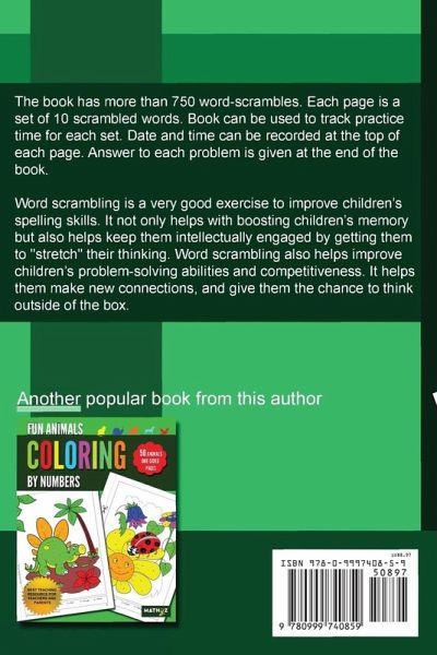 The book has more than 750 word-scrambles. Each page is a set of 10 scrambled words. Book can be used to track practice time for each set. Date and time can be recorded at the top of each page. Answer to each problem is given at the end of the book. Word scrambling is a very good exercise to improve children's spelling skills. It not only helps with boosting children's memory but also helps keep them intellectually engaged by getting them to "stretch" their thinking. Word scrambling also helps improve children's problem-solving abilities and competitiveness. It helps them make new connections, and give them the chance to think outside of the box.