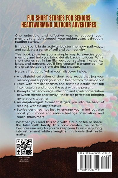 One enjoyable and effective way to support your memory retention through your golden years is through reading stories. It helps spark brain activity, bolster memory pathways, and cultivate a sense of self and connectivity. This book provides you a simple way to exercise your memory and help you bring details back into focus. With short stories set in familiar outdoor settings like parks, lakes, and gardens, you'll find yourself transported into the great outdoors from the first chapter. Here's a fraction of what you'll discover inside: ● A delightful collection of short easy reads that jog your memory and support your brain health from the inside out ● Tales with familiar themes and relatable details that tap into nostalgia and bridge the past with the present ● Prompts that encourage reflection and spark conversation between friends and family - these are perfect for bringing generations together! ● An easy-to-digest format that gets you into the habit of reading, without any pressure ● Stories designed not just to engage your mind but also boost your mood and reduce feelings of isolation, and much, much more! Whether you read this solo with a cup of tea or share the tales with family, this book creates the perfect low-pressure way for you to keep your brain sharp long into retirement while strengthening bonds that really matter.