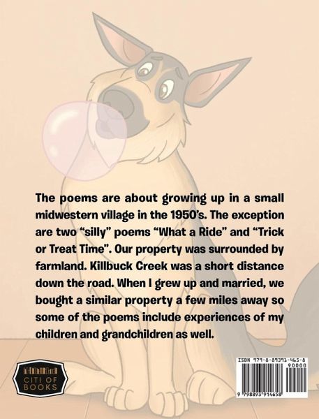 The poems are about growing up in a small midwestern village in the 1950's. The exception are two "silly" poems "What a Ride" and "Trick or Treat Time". Our property was surrounded by farmland. Killbuck Creek was a short distance down the road. When I grew up and married, we bought a similar property a few miles away so some of the poems include experiences of my children and grandchildren as well.