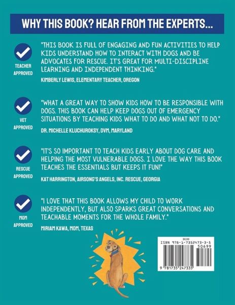 It's never too early to teach little hoomans about dog safety, care and health. Finn, the funny and loveable real-life character from the beloved The Finn Chronicles series uses his charming personality to teach kids All About Dogs in this delightful activity book! Through brain games, puzzles and coloring pages, Finn teaches dog care and safety essentials, the important role of dog rescues and veterinarians, and how to be a dog super hero. Endorsed by a veterinarian, teacher, rescue organization and a mom, it ticks all the boxes. Kids can continue to engage with Finn on his website and social media to keep the fun going. This is a perfect gift for children ages 5-10! "What a great way to show kids how to be responsible with dogs. This book can help dogs avoid difficult emergency situations by teaching kids what to do and what not to do." - Dr. Michelle Kluchurosky, DVM, Maryland "This book is full of engaging and fun activities to help kids understand how to interact with dogs and be advocates for rescue. It's great for multi-discipline learning and teaching independent thinking." - Kimberly Lewis, Elementary Teacher, Oregon "I love that this book allows my child to work independently, but also sparks great conversations and teachable moments for the whole family." - Miriam Kawa, Mom, Texas "It's so important to teach kids early about helping the most vulnerable dogs and the rescue organizations who save them. I love the way this book teaches the essentials, but keeps it fun!" - Kat Harrington, Airsong's Angels, Inc. Rescue, Georgia WINNER: 2021 International Royal Dragonfly Awards 2022 Story Monster Approved (voted on by child and adult judges)