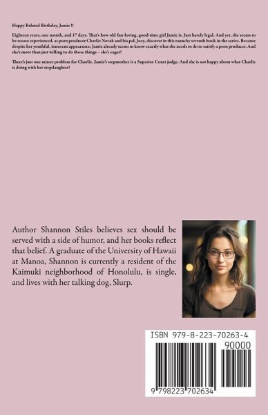 Happy Belated Birthday, Jamie !! Eighteen years, one month, and 17 days. That's how old fun-loving, good-time girl Jamie is. Just barely legal. And yet, she seems to be soooo experienced, as porn producer Charlie Novak and his pal, Joey, discover in this raunchy seventh book in the series. Because despite her youthful, innocent appearance, Jamie already seems to know exactly what she needs to do to satisfy a porn producer. And she's more than just willing to do those things - she's eager! There's just one minor problem for Charlie. Jamie's stepmother is a Superior Court judge. And she is not happy about what Charlie is doing with her stepdaughter!