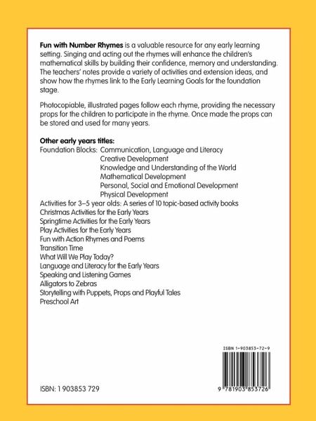 Fun with Number Rhymes is a valuable resource for any early learning setting. Singing and acting out the rhymes will enhance the children's mathematical skills by building their confidence, memory and understanding. The teachers' notes provide a variety of activities and extension ideas, and show how the rhymes link to the Early Learning Goals for the foundation stage. Photocopiable, illustrated pages follow each rhyme, providing the necessary props for the children to participate in the rhyme. Once made the props can be stored and used for many years.