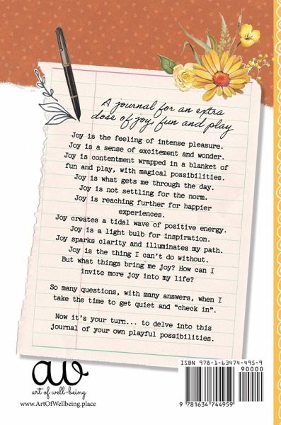 A guided journal for women with 45 prompts on the topic of joy and fun. Joy is the feeling of intense pleasure. Joy is a sense of excitement and wonder. Joy is contentment wrapped in a blanket of fun and play, with magical possibilities. Joy is what gets me through the day. Joy is not settling for the norm. Joy is reaching further for happier experiences. Joy creates a tidal wave of positive energy. Joy is a light bulb for inspiration. Joy sparks clarity and illuminates my path. Joy is the thing I can't do without. But what things bring me joy? How can I invite more joy into my life? So many questions, with many answers, when I take the time to get quiet and "check in". Now it's your turn... to delve into this journal of your own playful possibilities. Visit my website at www.ArtOfWellbeing.place to see more of my books, courses and free downloads.