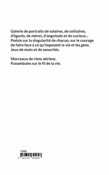 Galerie de portraits de solaires, de solitaires, d'égarés, de mères, d'angoissés et de curieux... Poésie sur la singularité de chacun, sur le courage de faire face à ce qu'imposent la vie et les gens. Jeux de mots et de sonorités. Morceaux de riens aériens, funambules de la vie.