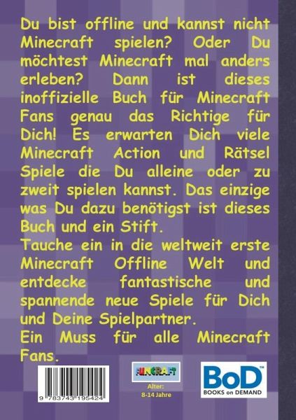 Altersempfehlung: 8 - 14 JahreDu bist offline und kannst nicht Minecraft spielen? Oder du möchtest Minecraft mal anders erleben? Dann ist dieses Buch genau das Richtige für dich! Es erwarten dich viele von Minecraft inspirierte Action und Rätsel Spiele die du alleine oder zu zweit spielen kannst. Das einzige was du dazu benötigst ist dieses Buch und ein Stift. Tauche ein in die weltweit erste Minecraft Offline Welt und entdecke fantastische und spannende neue Spiele für dich und deine Spielpartner. Ein Muss für alle Minecraft Fans.