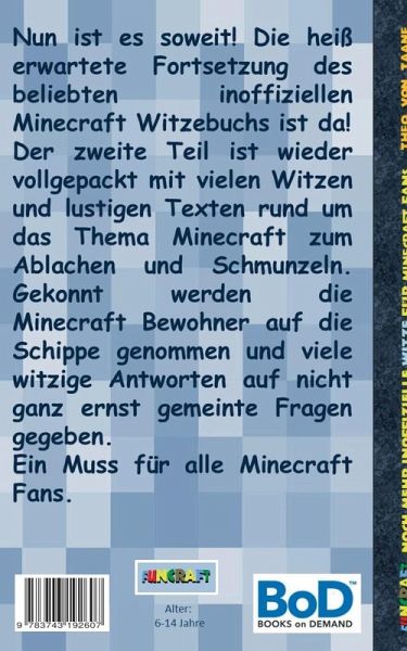 Nun ist es soweit! Die heiß erwartete Fortsetzung des beliebten Funcraft Witzebuchs ist da! Auch Teil 2 ist wieder vollgepackt mit vielen Witzen und lustigen Texten rund um das Thema Minecraft zum Ablachen und Schmunzeln. Gekonnt werden die Minecraft Protagonisten wie z.B. Steve, Creepers oder Zombies auf die Schippe genommen und viele witzige Antworten auf nicht ganz ernst gemeinte Fragen gegeben.Ein Muss für alle Minecraft Fans.