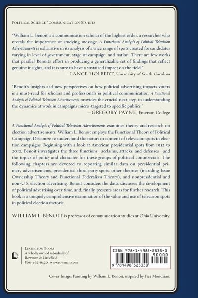 A Functional Analysis of Political Television Advertisements is a unique investigation into the extremely important medium of campaign advertising. The book analyzes presidential primary and general ads through 2012, ads from third party candidates, ads for governor and congress, and ads from foreign countries. It examines trends in political advertising content over time, contrasts different kinds of spots-primary versus general, incumbents versus challengers-and discusses the development of political ads over time.