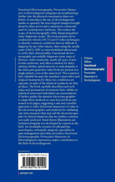 Functional Electromyography: Provocative Maneuvers in Electrodiagnosis integrates electrophysiology further into the physical examination than ever before. It introduces the use of electrodiagnostic studies to quantify the neurological changes brought about by three provocative maneuvers commonly used in contemporary medicine. This widens the scope of electromyography while sharpening physicians' diagnostic acuity. The book presents nerve conduction velocity (NCV) and H-reflex techniques to identify common conditions that are difficult to diagnose by any other means, often using the needle exam (EMG), MRI or musculoskeletal ultrasound to verify their clinical utility. Functional electromyography successfully diagnoses some cases of thoracic outlet syndrome, nearly all cases of piriformis syndrome, and offers a method for determining whether spinal stenosis or radiculopathy is the main pain generator when both are present in a single patient, even at the same level. This is particularly valuable because the standard conservative and surgical treatments for these two conditions are opposite, in spite of the identical symptom-set they produce. The book carefully describes each technique and persuasively documents their validity in statistical series and individual case presentations. It further guides the attentive electromyographer to adapt these methods to cases beyond those presented in its pages, suggesting a safe and scientific approach to other functional maneuvers of value to the electromyographer, and methods for validating one-time measures that may aid the electromyographer in clinical situations that are neither common nor easily analyzed. Hand drawn illustrations are included alongside text developed by experts in the field. An invaluable resource for physiatrists, neurologists, orthopedic surgeons, specialists in pain management and other providers, Functional Electromyography: Provocative Maneuvers in Electrodiagnosis represents a major contribution to the field of electrodiagnosis.