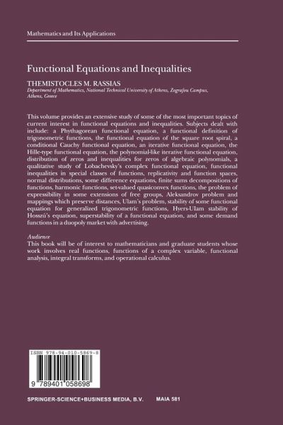 Functional Equations andInequalities provides an extensive studyofsome of the most important topics of current interest in functional equations and inequalities. Subjects dealt with include: a Pythagorean functional equation, a functional definition oftrigonometric functions, the functional equation ofthe square root spiral, a conditional Cauchy functional equation, an iterative functional equation, the Hille-type functional equation, the polynomial-like iterative functional equation, distribution ofzeros and inequalities for zeros of algebraic polynomials, a qualitative study ofLobachevsky's complex functional equation, functional inequalities in special classesoffunctions, replicativity and function spaces, normal distributions, some difference equations, finite sums decompositions of functions, harmonic functions, set-valued quasiconvex functions, the problem of expressibility in some extensions of free groups, Aleksandrov problem and mappings which preserve distances, Ulam's problem, stability of some functional equation for generalized trigonometric functions, Hyers-Ulam stability of Hosszil's equation, superstability of a functional equation, and some demand functions in a duopoly market with advertising. It is a pleasureto express my deepest appreciationto all the mathematicians who contributed to this volume. Finally, we wish to acknowledge the superb assistance provided by the staffofKluwer Academic Publishers. June 2000 Themistocles M. Rassias xi ON THE STABILITY OF A FUNCTIONAL EQUATION FOR GENERALIZED TRIGONOMETRIC FUNCTIONS ROMAN BADORA lnstytut Matematyki, Uniwersytet Sli;ski, ul. Bankowa 14, PL-40-007 Katowice, Poland, e-mail: robadora@gate. math. us. edu. pl Abstract. In the present paper the stability result concerning a functional equation for generalized trigonometric functions is presented. Z.