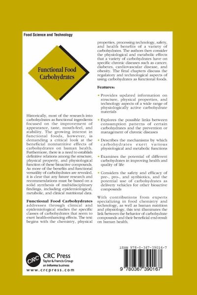 Functional Food Carbohydrates presents comprehensive coverage of a broad range of physiologically active carbohydrate compounds and their roles in the promotion of health and the prevention of disease. It provides the most up-to-date information available on the chemistry, physical properties, processing effects, production, and physiological function of these food constituents. The volume discusses the specific classes of carbohydrates in foods that seem to exert health-enhancing effects based on clinical and/or epidemiological studies and reviews the physiological and metabolic roles that different carbohydrates have in disease prevention and management, focusing on chronic diseases. "The new edition updates the nutritional information, analytical and physical properties of hydrocolloids. I found the chapter on Food Regulations: Health Claims ... most useful ... The chapter is an excellent description of a confused and confusing subject. ... the book is an excellent treatment of a rapidly moving area of carbohydrates. This book presents a comprehensive assessment of the current state of the chemistry nutrition and health aspects of specialty fats and oils. The treatment is authoritative and throughout maintains the highest scientific and ethical standards." - Glyn O. Phillips, Phillips Hydrocolloids Research Centre, NEWI, Wrexham, UK in Food Hydrocolloids 22(2008)
