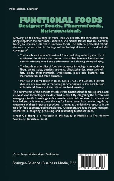 Foreword: Theodore P. Labuza.- Preface: Israel Goldberg.- Contributors.- I. Introduction.- Chapter1. Introduction.- II. Health Attributes of Functional Foods.- Chapter2. Reducing the risk of cardiovascular disease.- Chapter3. Reducing the risk of cancer.- Chapter4. Functional foods in the control of obesity.- Chapter5. Nutrient control of immune function.- Chapter6. Dietary factors modulating the rate of aging.- Chapter7. Mood and performance foods.- Chapter8. Medical foods.- III. Health Functionality of Food Components.- Chapter9. Dietary fiber.- Chapter10. Special physiological functions of newly developed oligosaccharides.- Chapter11. Sugar alcohols.- Chapter12. Amino acids, peptides and proteins.- Chapter13. Vitamins for optimal health.- Chapter14. Lactic acid bacteria as promoters of human health.- Chapter15. Nutrition of macrominerals and trace elements.- Chapter16. Fatty acids.- Chapter17. Phytochemicals and antioxidants.- IV. Market and Competition.- Chapter18. Functional foods in Japan.- Chapter19. The development of the functional food business in the United States and Europe.- Chapter20. The potential role of functional foods in medicine and public health.- Chapter21. The role of marketing communication in the introduction of functional foods to the consumer.- Chapter22. The food industry's role in functional foods.- V. Consumer's Viewpoint.- Chapter23. Consumers' view on functional foods.- VI. Future Prospects.- Chapter24. Future prospects for functional foods.