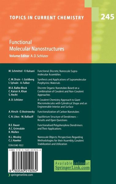 M. Schmittel, V. Kalsani: Functional, Discrete, Nanoscale Supramolecular Assemblies .- C. M. Drain, I. Goldberg, I. Sylvain, A. Falber: Synthesis and Applications of Supramolecular Porphyrinic Materials .- M.A. B. Bloc, C. Kaiser, A. Khan, S. Hecht: Discrete Organic Nanotubes Based on a Combination of Covalent and Non-Covalent Approaches .- A. D. Schlüter: A Covalent Chemistry Approach to Giant Macromolecules with Cylindrical Shape and an Engineerable Interior and Surface A. Hirsch, O. Vostrowsky: Functionalization of Carbon Nanotubes C. N. Likos, M.Ballauff: Equilibrium Structure of Dendrimers - Results and Open Questions .- R.E. Bauer, A.C. Grimsdale, K. Müllen: Functionalised Polyphenylene Dendrimers and Their Applications .- K.L. Wooley, C.J. Hawker: Nanoscale Objects: Perspectives Regarding Methodologies for their Assembly, Covalent Stabilization and Utilization