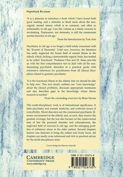 Until recently the literature has sadly neglected the commonest disorders of old age which, lacking a demonstrable organic basis, have tended to be called 'functional'. Professor Chiu and Dr Ames provide us with the first comprehensive text to deal with all the non-dementing psychiatric disorders in a practical guide and exhaustive reference. Interfacing psychiatry and somatic medicine, and confronting the issues of co-morbidity, this text clearly outlines our core knowledge about clinical problems, discussing appropriate treatments and highlighting areas for future research. Along with case histories which bring much of the detail into lively focus, chapters are neatly cross-referenced and are rich in practical advice for multidisciplinary management strategies. A unique group of contributors of international renown includes members of a number of allied health disciplines relevant to old-age psychiatry. This text is sure to be of widespread interest to all professionals concerned with the health of older people.