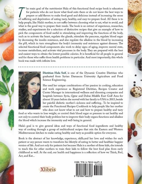 The main goal of the nutritionist Hala of this functional food recipe book is education for patients who do not know what food suits them or do not know the best ways to prepare or add flavors to make food good and delicious instead of increasing the sense of suffering and deprivation of eating tasty, healthy, and easy-to-prepare food. All these is to help people, like Hala's mother, to not suffer between choosing what to eat, what to avoid, and what is the good way to prepare their meals. The book is an extract of experience, researches, studies, and experiments for a selection of distinctive recipes that give an example of how to pick the components of food useful in stimulating and improving the functions of the body, such as to activate the heart, regulate the glands, stimulate the pancreas, regulate blood sugar by decreasing the insulin resistance, and also regulate the alkaline in the blood by increasing the pH, which in turn strengthens the body's immunity and resistance against diseases. The selected functional food components also work to delay signs of aging, improve mental state, increase metabolism, and activate vital processes in the body. They are prepared with the best and easiest ways to obtain the lowest possible calories. It is beneficial for all people in general and for those who suffer from health problems in particular. And most importantly, this whole book was made with infinite love.