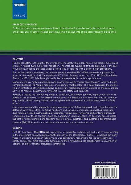 Functional Safety is the part of the overall system safety which depends on the correct functioning of safety-related systems for risk reduction. The intended functions of these systems, i.e. the safety functions, must be executed under defined fault conditions with a defined high probability. For the first time, a standard, the relevant generic standard IEC 61508, demands a quantitative proof for the residual risk! The standards IEC 61511 (Process Industry), IEC 61513 (Nuclear Power Plants) or IEC 62061 (Machinery) specify the requirements for various applications. Modern technical systems operating and controlling safety-critical processes are more and more complex because the requirements are increasingly multifaceted. This book discusses the monitoring or controlling of vehicles, railways and aircraft, machinery, power stations or chemical plants as well as medical equipment or systems in other safety-critical areas. Reliability means the functioning under all conditions. In modern systems in particular, the complexity of the software has increased to such an extent that faults can never be ruled out completely. In this context, safety means that the system will not assume a critical state, even if a fault occurs. This book examines the standards, reviews measures for determining risk and risk reduction, the different safety levels (SIL1 to SIL4), hardware and software components as well as corresponding models, needed mathematical procedures, various safety systems and contains numerous examples of how these concepts have been applied in various sectors. As such, it offers valuable support for understanding and realising safe electrical, electronic and electronic programmable systems (E/E/PES).