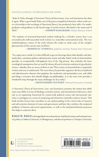 Ch. 1 The Framework of Functional Theory Ch. 2 State and Government: Ontology and Function Ch. 3 Structural Functionalism: Stable States and Organizational Forms Ch. 4 The Cybernetic State: Of Homeostasis, Entropy, and Feedback Loops Ch. 5 How Institutions Shape Political Action Ch. 6 Behavioral Paradigms in Politics and Institutions Ch. 7 Law, Justice, and Jurisprudence Ch. 8 Political Reasoning and Political Judgement Ch. 9 Governing the International Commons: Ecopolitics and the Limits of Regulation Ch. 10 State and Institutions as Organizing Symbols